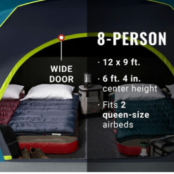 The wide door design makes it easy to bring in air beds and other gear, while mesh storage pockets and a gear loft keep small essentials organized. Measuring 12 x 9 ft with a center height of 6 ft 4 in, the tent comfortably fits two queen-size air beds and includes a carry bag for convenient transport and storage.