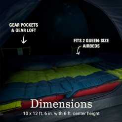 Enjoy added convenience with the E-port for power access, plus gear pockets and a loft to keep essentials organized and off the floor. Measuring 10 x 12 ft. 6 in. with a center height of 6 ft., it comfortably fits 2 queen-size airbeds for a cozy camping experience.